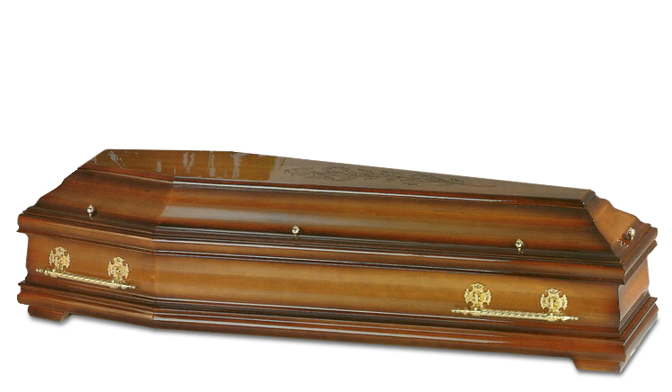 Modell Nr. 280A Natur Nussbaum-HellKörperformsarg in Pappel massiv, Eingefräste Rose, Nussbaum Farben gebeizt, Natur lackiert mit Zierschrauben, Messing-Stangengriffen und Möbeleckfüssen