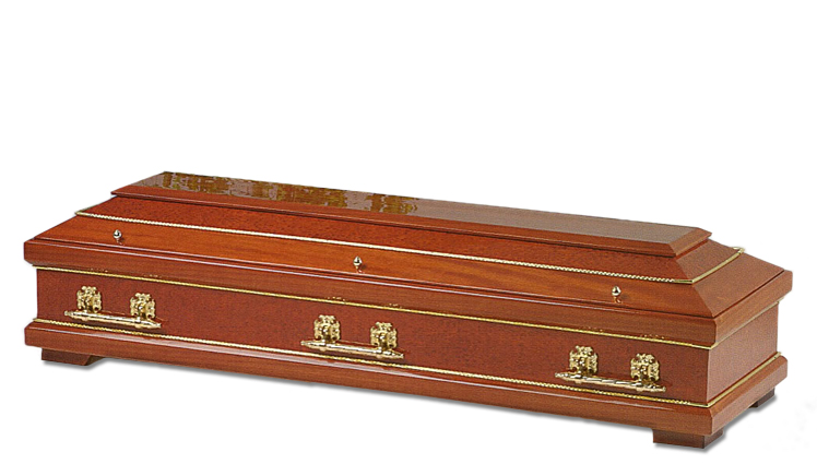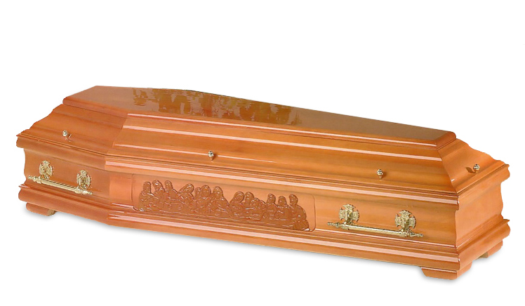 Modell Nr. 282 Mahagoni-HellKörperformsarg in Pappel massiv, Abendmahl, Mahagoni-Hell gebeizt, Natur lackiert mit Zierschrauben, Messing-Stangengriffen und Möbeleckfüsse