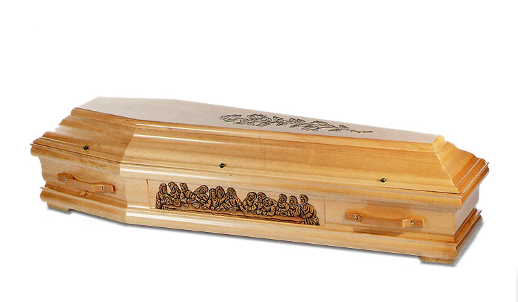 Modell Nr. 282 BucheKörperformsarg in Pappel massiv, Abendmahl, Eingefräste Rose, Buchenfarben gebeizt, Natur lackiert mit Zierschrauben, Holzgriffen und Möbeleckfüsse