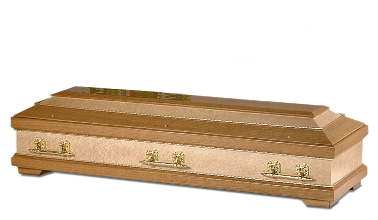 Modell Nr. 510Körperformsarg in Fichte massiv, Vogelaugenahorn und Eiche furniert, dunkel gebeizt, Natur lackiert mit Zierschrauben, Messing-Stangengriffen und Möbeleckfüsse (Nur inkl. Innenausstattung lieferbar)