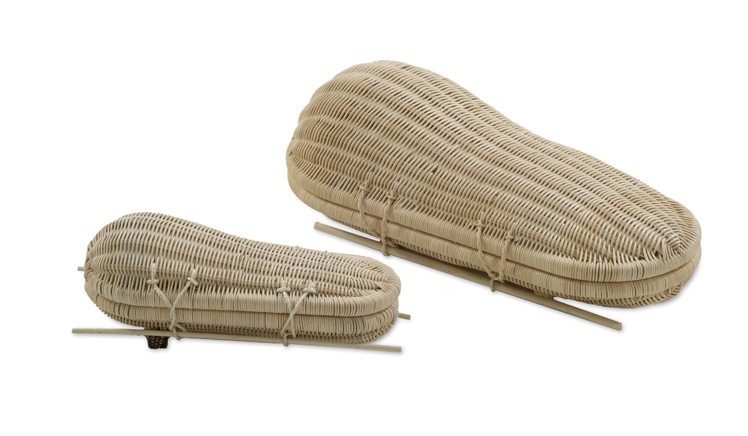 Geflechteter Kindersarg aus Weidenholz mit Verschlusstange und Füssen