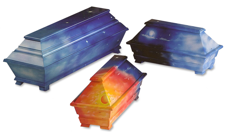 Kindersärge in Fichte massiv in den Airbrush Motiven Sternenhimmel und Sonnenuntergang mit Zierschrauben und Möbeleckfüssen