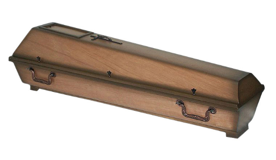 Modell Nr. 100Erdbestattungssarg Reform in Okumé auf Pappel Multiplex furniert und Fichte massiv, patiniert, Natur lackiert mit Zierschrauben, Beschlag 1900AK, Schieber, Sargkreuz und Möbeleckfüssen