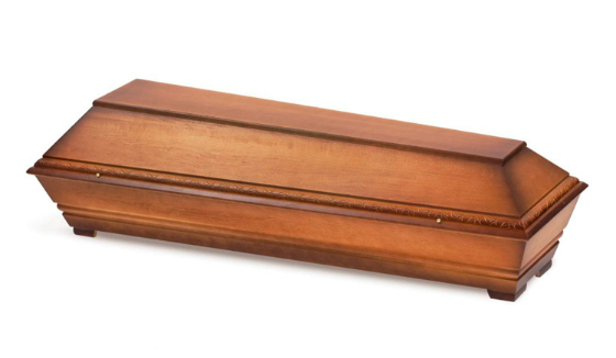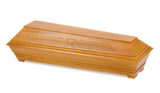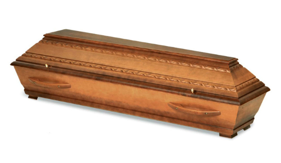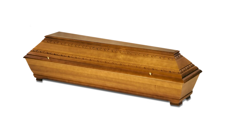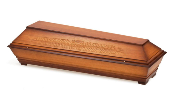 Modell Nr. 630AErdbestattungssarg in Pappel massiv, Blätterranken-Muster, dunkel gebeizt, patiniert, Natur lackiert mit Zierschrauben und Möbeleckfüssen (auch mit Holzgriffen lieferbar)