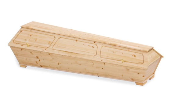 Modell Nr. 130Erdbestattungssarg in Fichte massiv, Oberteil gekehlt, patiniert, Natur lackiert mit Zierschrauben, Beschlag 1900AK und Möbeleckfüssen